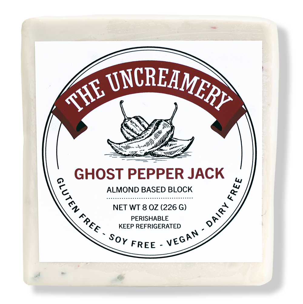 This delicious Ghost Pepper Jack block takes traditional pepper jack to a whole new level of spice with enough ghost pepper mixed in to make sure it brings the heat! Great on sandwiches, on crackers, cubed up for appetizers, or spicing up your favorite pizzas and pastas, if you like life spicy, this is your dairy-free cheese!